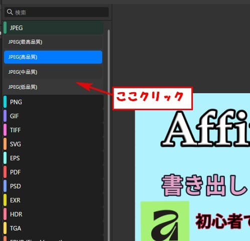 左側: 書き出し形式(JPEG、PNG、PDFなど)を選択します。Affinityは非常に多くの形式に対応しています。