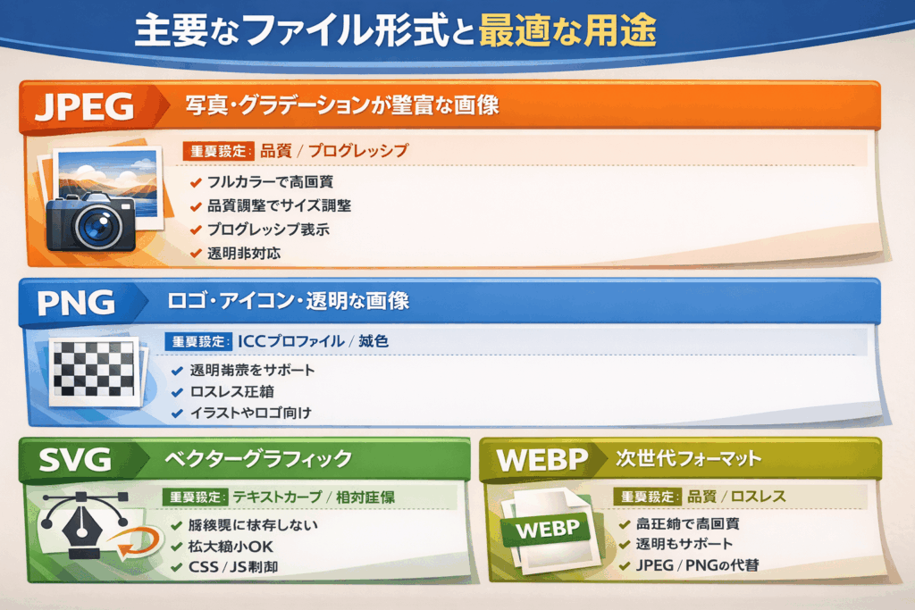 • ICCプロファイルの埋め込み: 異なるデバイスでも色が正しく表示されるよう、カラープロファイルをファイルに含めることができます。