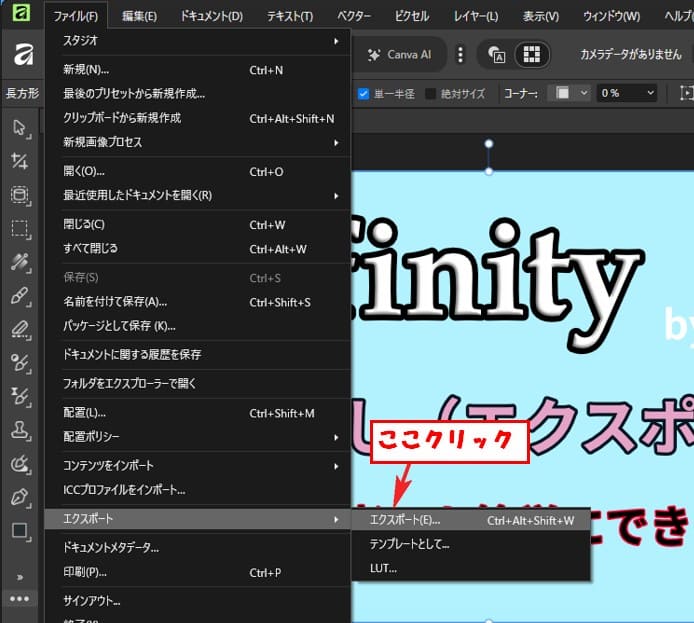 書き出したい画像を表示した状態で、上部メニューの [ファイル] > [エクスポート] > [エクスポート] をクリックします。