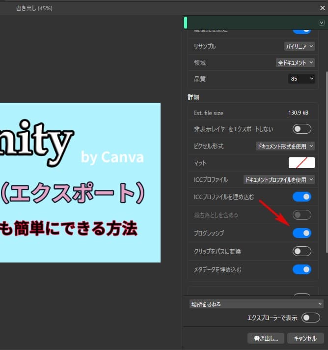 通常はデフォルトでも十分ですが、Web用なら段階的に圧縮する「プログレッシブ」にチェックを入れるのも有効です。