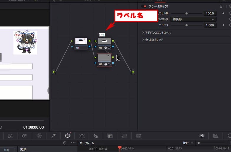 今回は2か所にモザイク効果を反映して、1つはブラーの値を変更してモザイクをかけたりはずしたりする方法です。