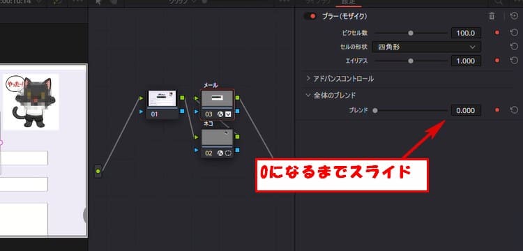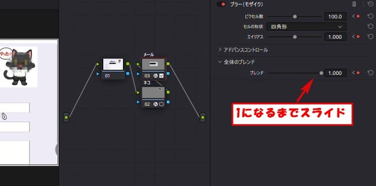 次にブレンドの値を変更して一定時間だけモザイクをかけるやり方をやっていきます。