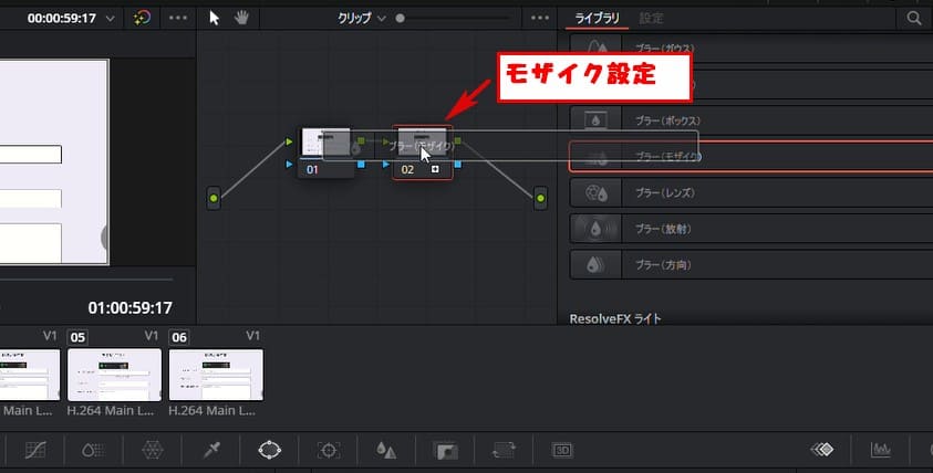 ライブラリーの中のブラー(モザイク)をドラッグ&ドロップで設定します。