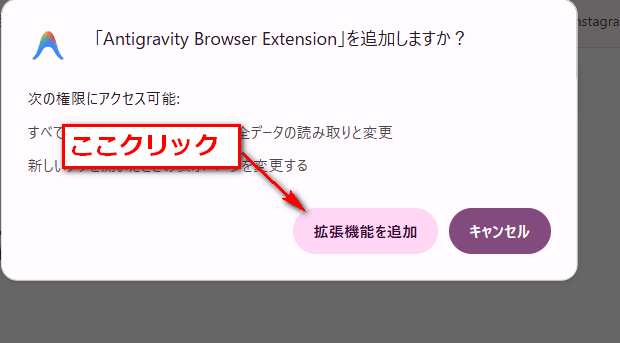「Antigravity Browser Extension」がchromeに追加されました。と上部に表示されればOKです