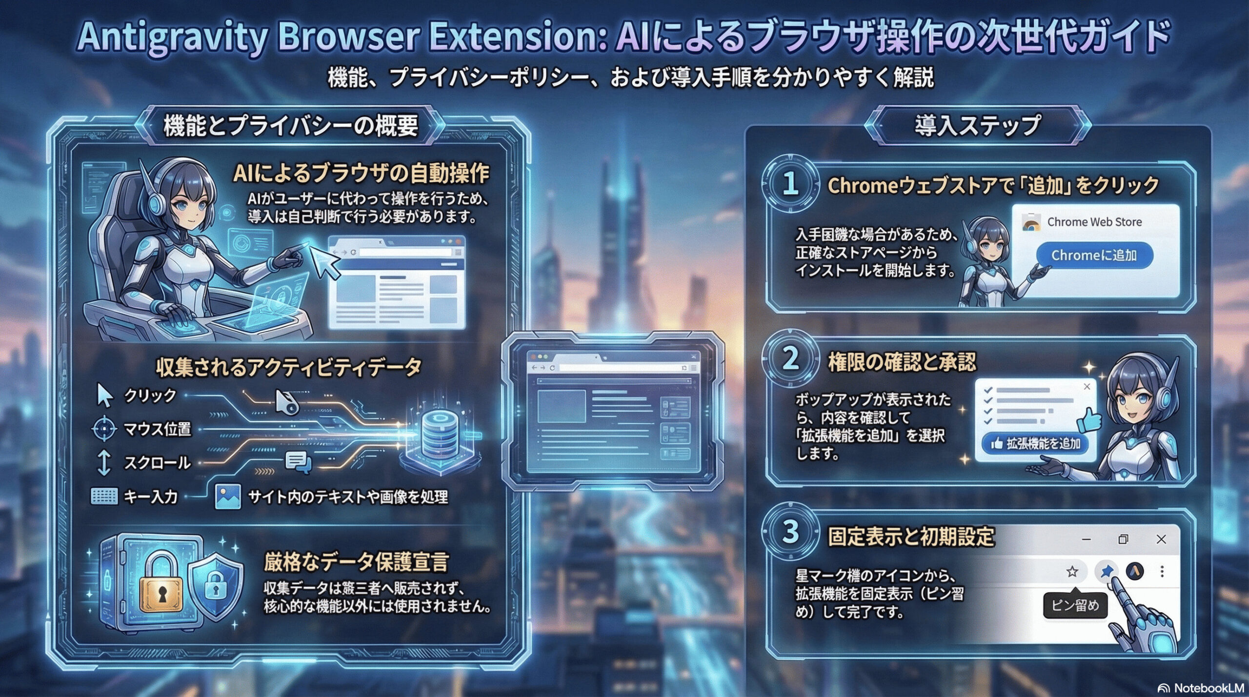 「Antigravity Browser Extension」を安全に導入するために注意すべき点は、主にAIによる自動操作の性質と、取り扱われるデータの範囲かと思います。